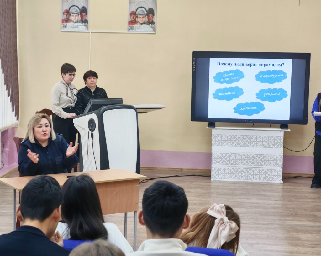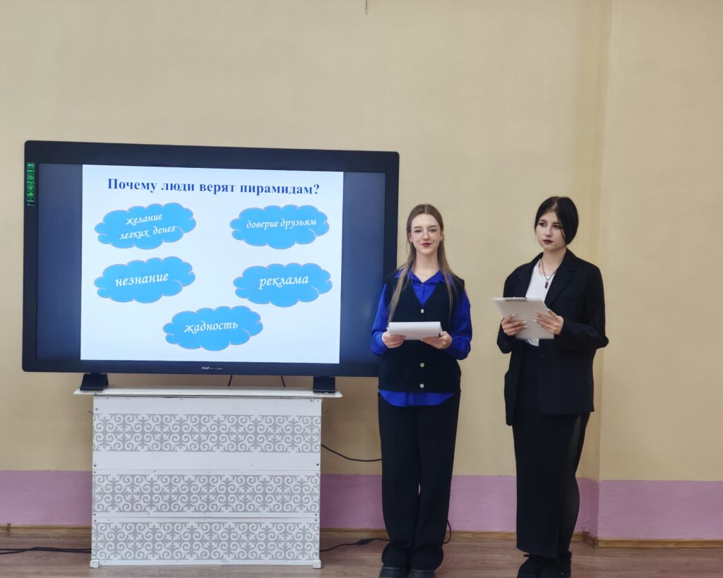 Педагогтар Хайбуллина Н.З. мен Иванцик Н.В. студенттерге қаржы пирамидаларының мәні мен белгілері туралы айтып, мұндай схемалар тек жеке азаматтарға ғана емес, тұтастай қоғамға да үлкен зиян келтіретінін атап өтті.