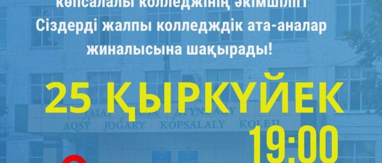 Жаяу Мұса атындағы Ақсу жоғары көпсалалы колледжінің әкімшілігіСіздерді жалпы колледждік ата-аналар жиналысына шақырады. 🗓️Жиналыс 2025 жылғы 25 қыркүйекте🕘сағат 19:00-де колледждің акт залында өтеді. 📍Жиналыс тақырыбы:«Отбасы және колледж: тәрбиелеу