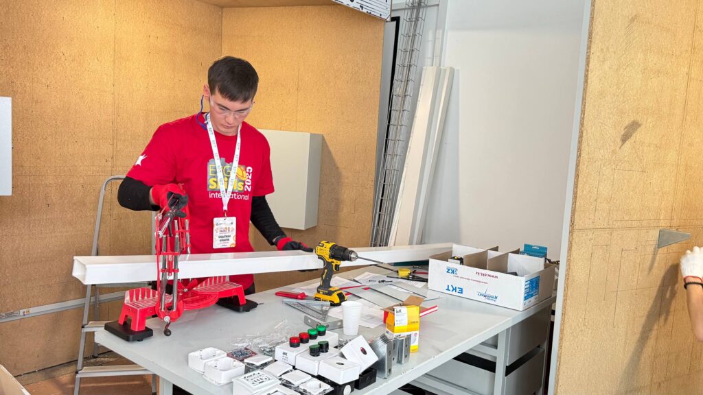⚡ В компетенции «Электромонтаж» участвуют 11 конкурсантов, среди них — Хоу Юйхан из того же колледжа провинции Шэньси, а также участники из Костаная, Актобе и Павлодарской области.