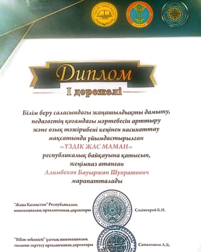 Преподаватель общественно-гуманитарных дисциплин Алимбеков Бауыржан Шухратович стал победителем республиканского конкурса «Лучший молодой специалист», заняв 1 место.