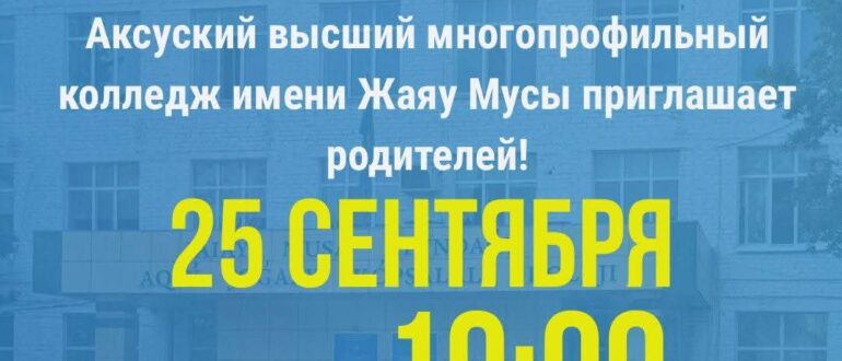 Администрация Аксуского высшего многопрофильного колледжа имени Жаяу Мусы приглашает Вас на общеколледжное родительское собрание, которое состоится 🗓️25 сентября🕐в 19.00 в актовом зале колледжа. 📍Тема собрания: «Семья и колледж:
