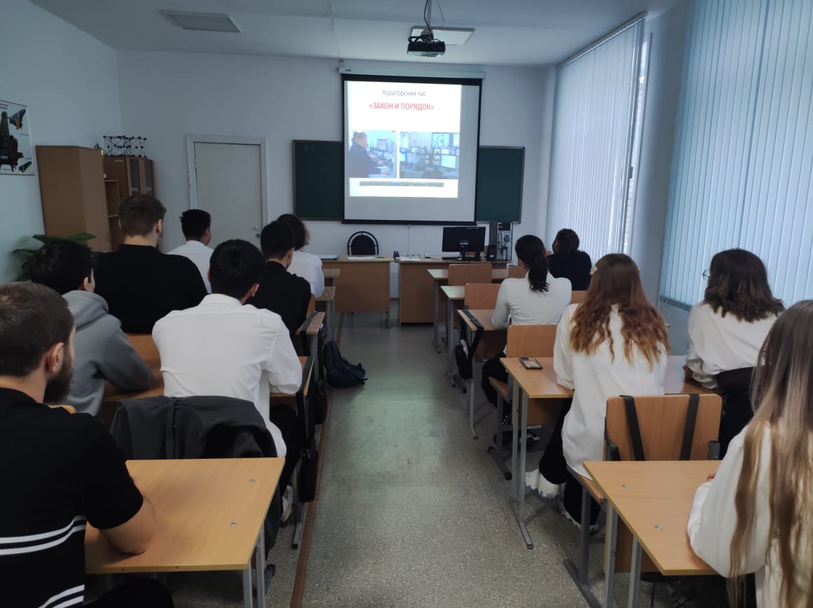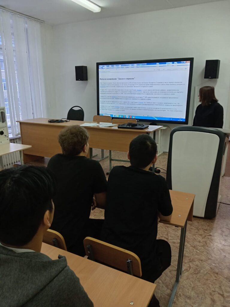 Тм-323 және Эм-323 топтарында «Заң және тәртіп» тақырыбында кураторлық сағат өтті. Кездесуде заңды сақтау, адамды құрметтеу және өз ісіне жауапкершілікпен қарау мәселелері сөз болды.