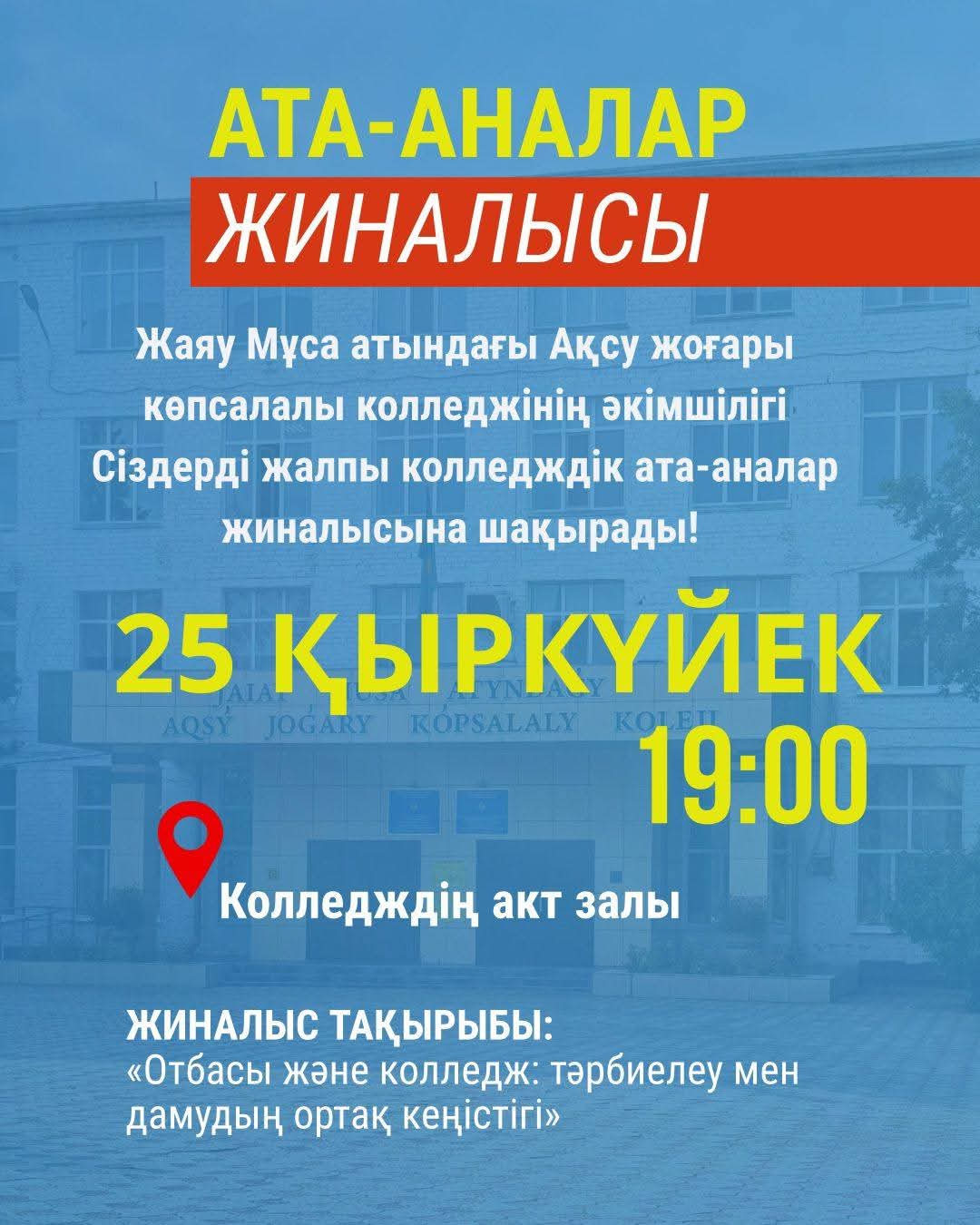 Сіздерді жалпы колледждік ата-аналар жиналысына шақырады.